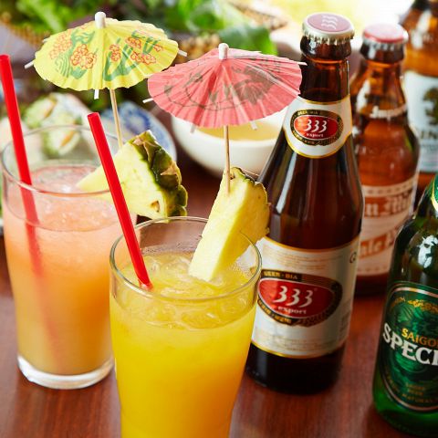 333、シンハ―などのビールはもちろん、サイゴンスペシャル、プーケットなどの珍しいビール、またその他にもルアモイなどのベトナム酒や、当店オリジナルカクテル、アオザイビューティーなど、当店にしかないアジアンドリンクがたくさん🍸